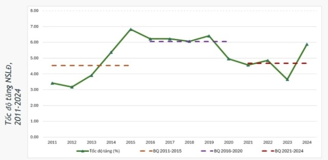 Tốc độ tăng năng suất lao động Việt Nam có xu hướng giảm dần. Số liệu: Viện Nghiên cứu quản lý kinh tế Trung ương (CIEM)